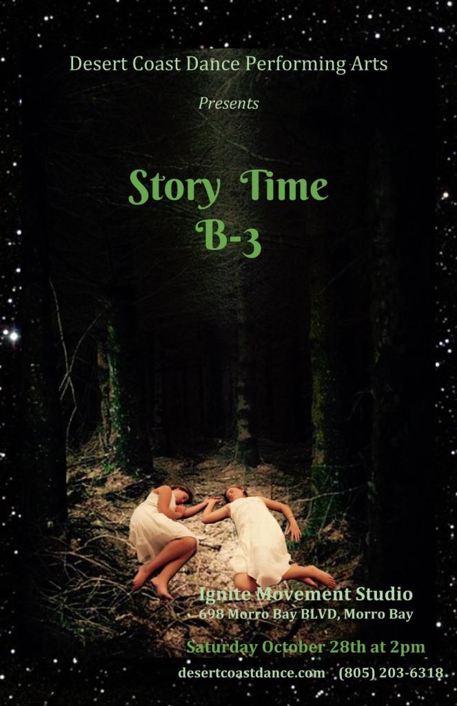 “Story Time B3” is the third story in a series that we have performed at our local libraries in the past. It’s a dance performance that’s a lot of fun and an opportunity to combine all of our classes and different dance styles, props, and drama into one big story! The shows always have a very entertaining narrator who guides the audience through the story.